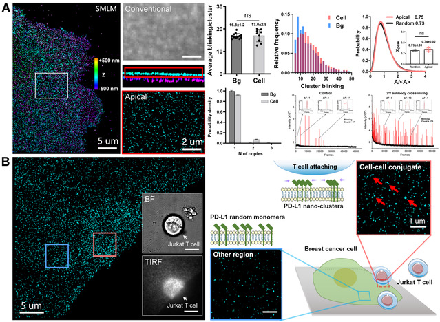 程序性死亡配体1(Programmed Death-Ligand 1,PD-L1)是介导肿瘤免疫逃逸的关键免疫检查点蛋白。它广泛表达于多种肿瘤细胞表面,通过与T细胞表面的程序性死亡受体1(PD-1)结合,向免疫系统发出“don’t find/kill me(别找我/别杀我)”信号,使肿瘤细胞得以逃避免疫清除。PD-L1/PD-1通路的发现推动了癌症免疫治疗的重大突破,相关研究荣获2018年诺贝尔生理学或医学奖。然而,PD-L1在细胞质膜上纳米尺度空间组织分布特性仍未被探索。